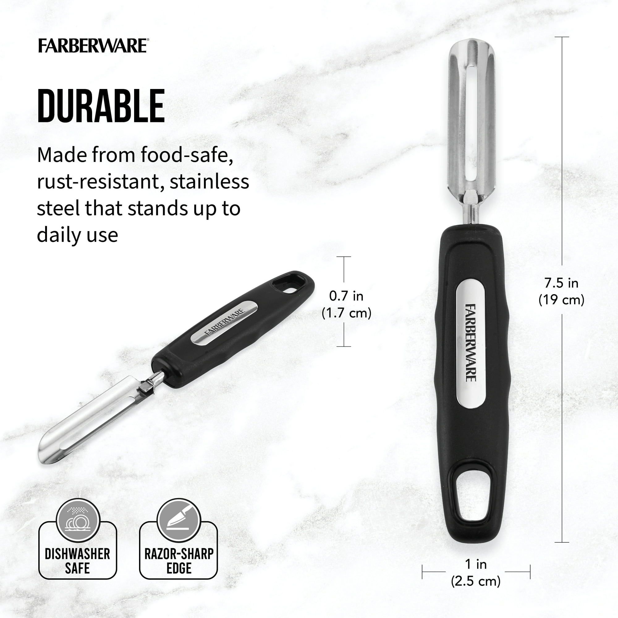 The Professional Swivel Peeler features a sharp, swiveling blade that easily peels fruits and vegetables. This essential tool features an ergonomic handle that provides optimal comfort and control. Made from durable, rust-resistant stainless steel to withstand daily use. Dishwasher safe. Lifetime Limited Warranty.
