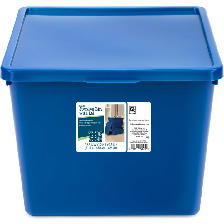 Plastic Large Stacking Bin with Lid, Stadium Blue, Kids and Tweens. Stack up to (3) bins high. Each bin holds up to 15 pounds. You can stack and utilize with alternative Medium Stacking Bin with Lid. Great for storing toys, collectables, clothing, crafts, and supplies. Fits on standard 12" deep wire closet shelving and dorm room closets.