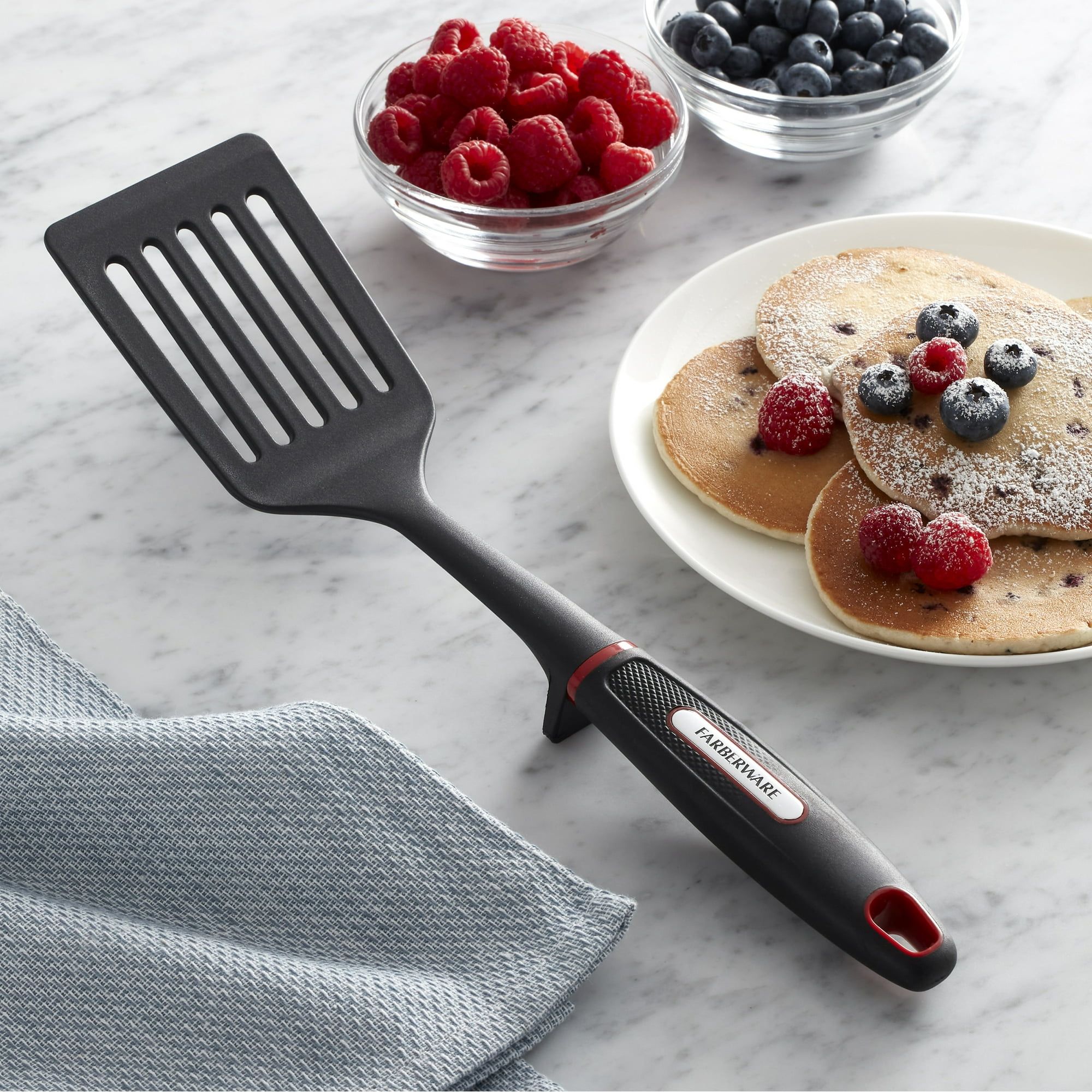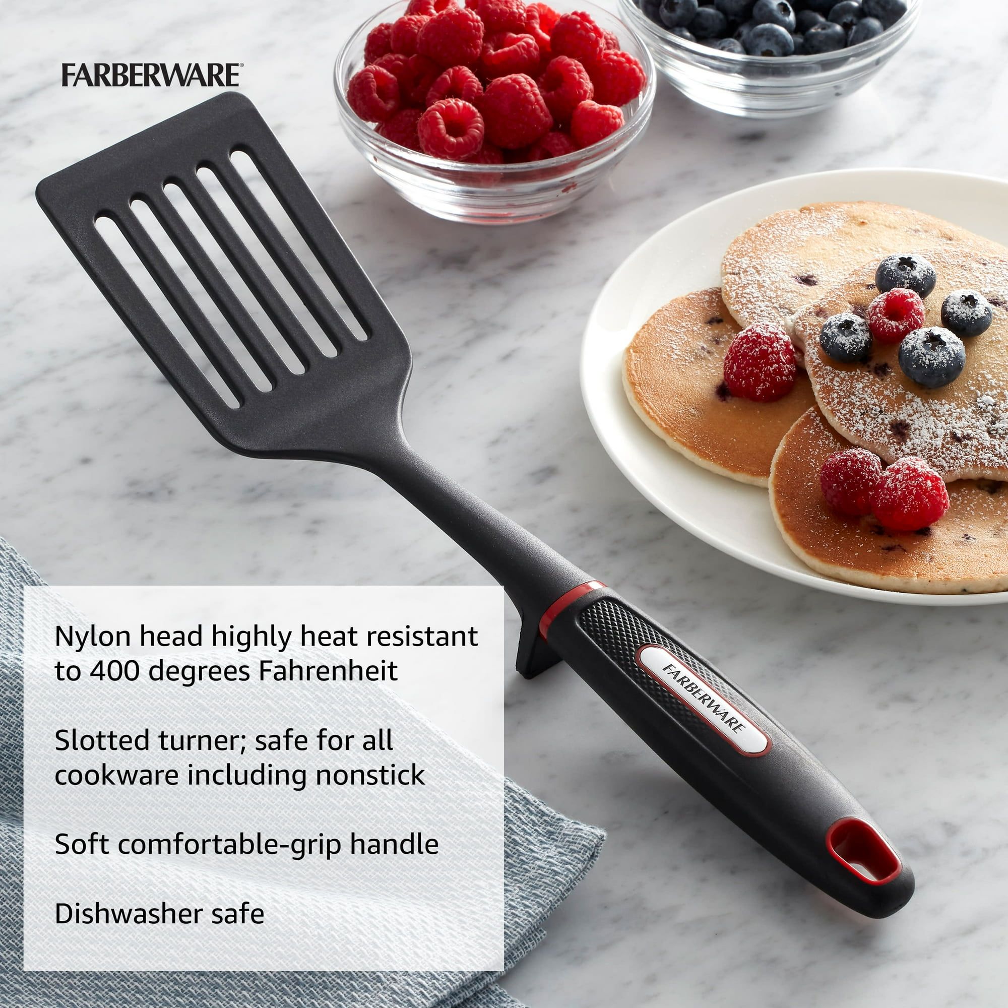 Flip, stir, sauté, and stir fry a variety of foods with the Professional Soft Grips Turner. The slotted head strains grease and other liquids from food while cooking, and is heat-resistant to 400°F. This versatile turner is made from durable nylon and is safe for use on all cookware, including nonstick. The tip-up feature raises the head when not in use to keep countertops clean. Dishwasher safe. Lifetime Limited Warranty.