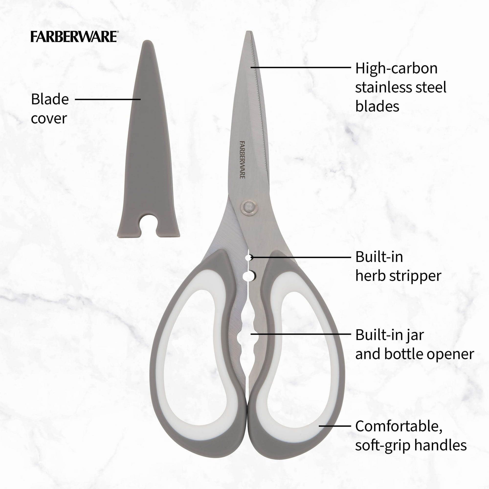 The All-Purpose Scissors with gray soft-grip handles are perfect for cutting meat, vegetables, twine, and more. These scissors feature ultra-sharp stainless steel blades that will retain an extremely sharp edge, with micro-serrations that provide a precise, clean cut. They also feature a built-in herb stripper and a bottle and jar opener. The extra thick, rust-resistant stainless steel blades stand up to daily use, while the ergonomically designed handles feature a soft grip for comfort in the hand while using. These essential shears with gray handles come with a protective blade cover to ensure safe, secure storage in drawers. Hand wash with warm water and a mild detergent; rinse and dry immediately.