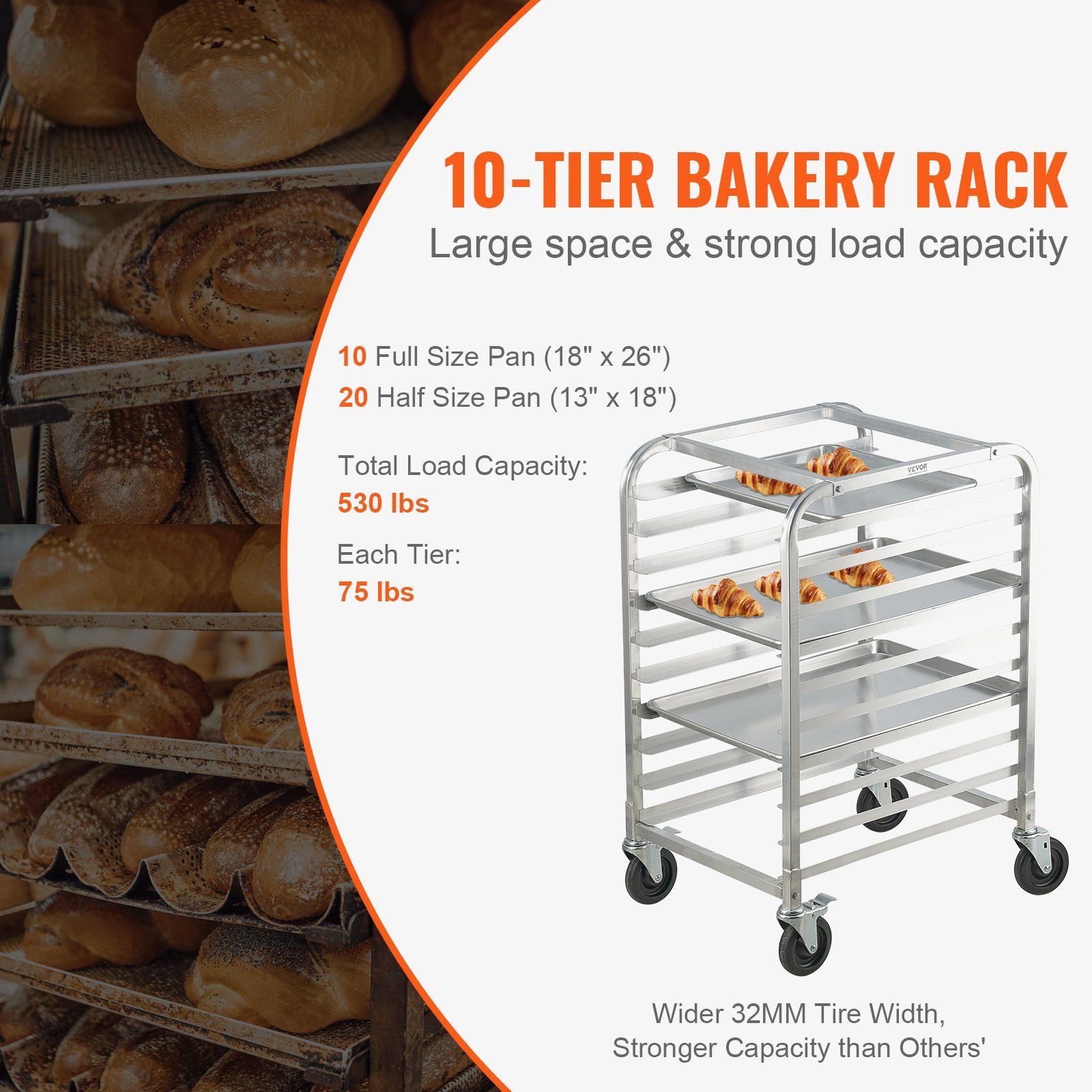 This kitchen aluminum baking rack holds up to 10 full size or 20 half size sheet pans with 75 lb capacity per tier (total capacity: 530 lb), which is enough for containing baked or other prepared food. Additionally, Certification ensures high standards of security.