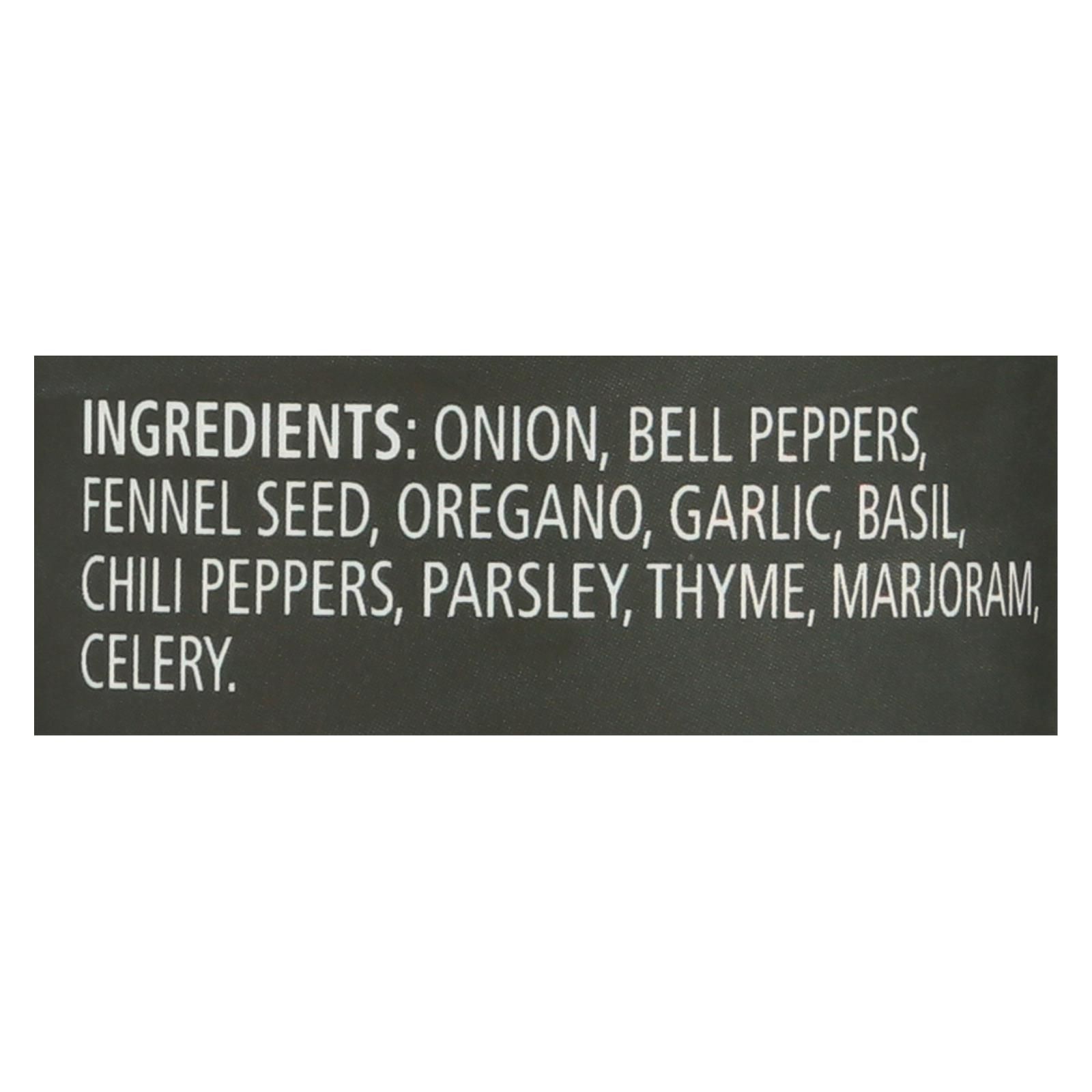 ingredients : onion;bell peppers;fennel seed;oregano;garlic;basil;chili peppers. Parsley;thyme;marjoram;celery