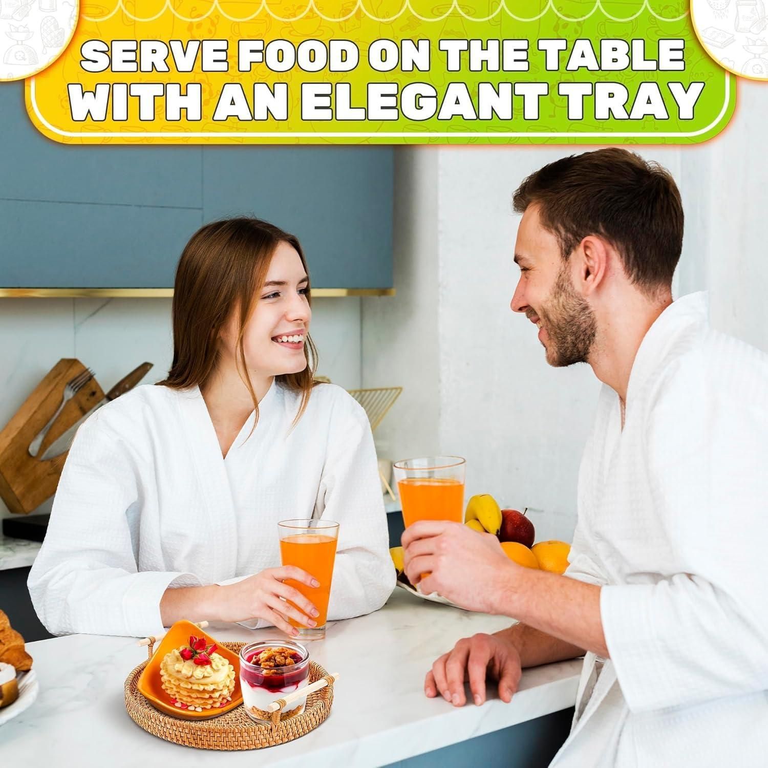 2.wide application of woven serving tray: the round wicker tray for food is great for using on a table, desk, coffee table tray round, cabinet, dressing round decorative tray or any other pieces of furniture in your beautiful home. round rattan round tray is suitable for coffee, tea, desserts, bread, cakes, candies, fruits, vegetables, etc