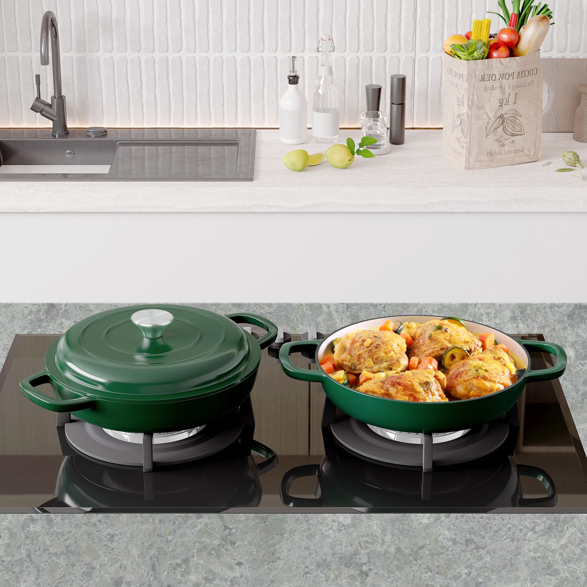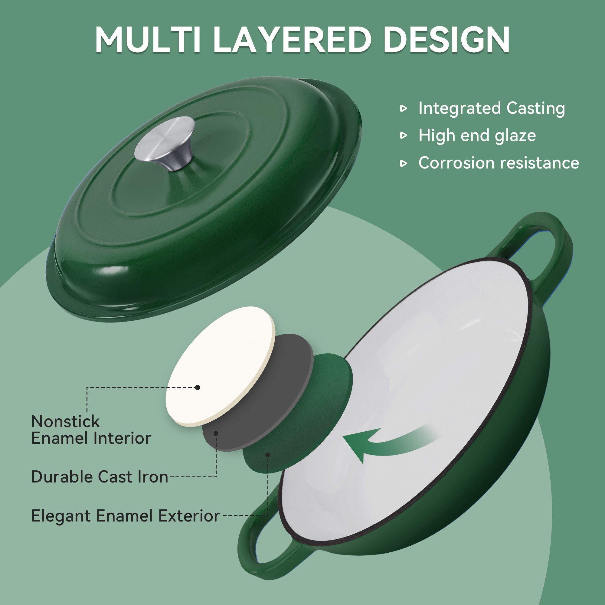 ��ENCLOSED THERMAL CIRCLE: This enamel Dutch oven adopts a circular shower type lid design, with a convex lid design, allowing water vapor to circulate in the pot, locking in the nutrients and moisture of the food, evenly falling on the food, maintaining the original nutrients, and having good thermal insulation performance.